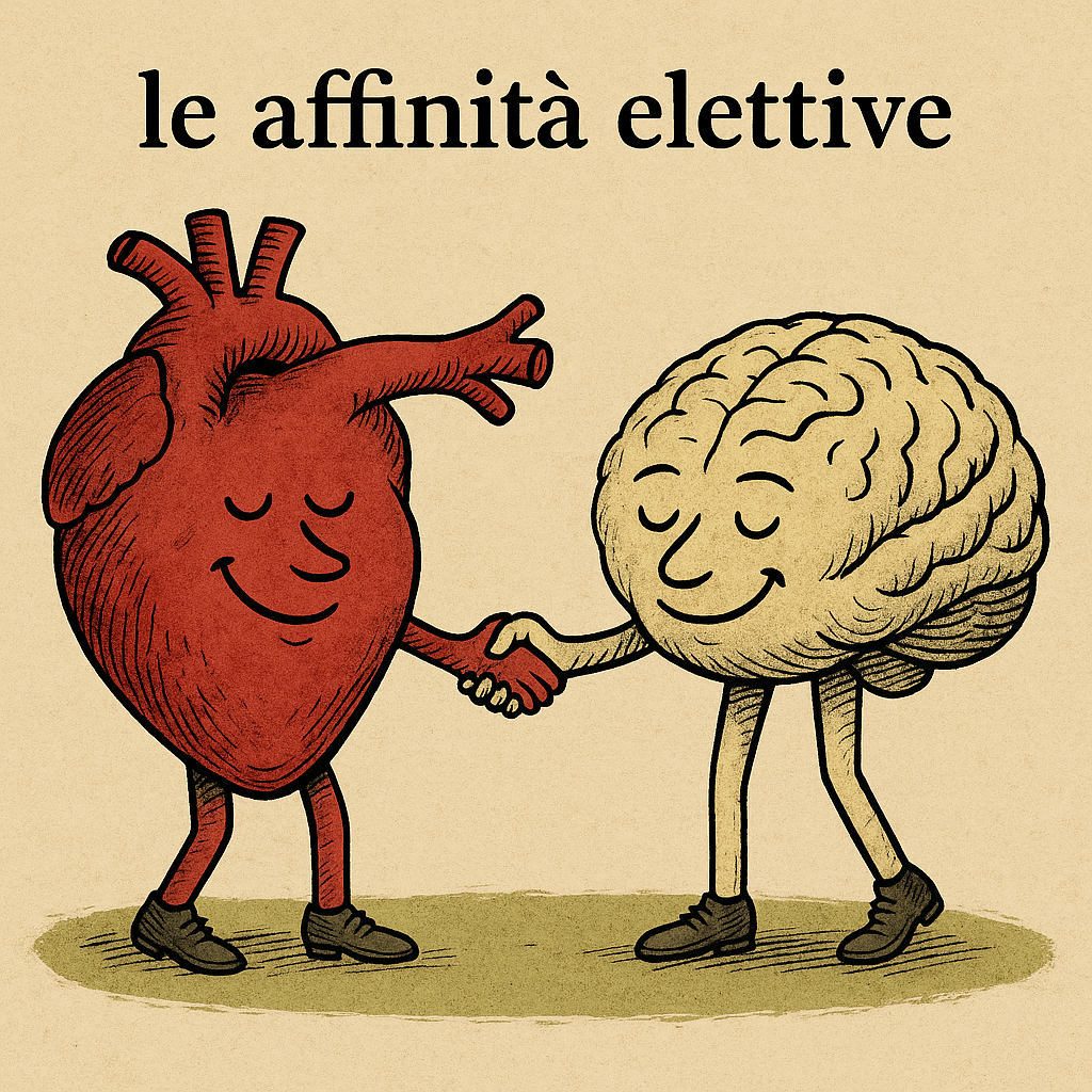 Il valore simbolico di questa espressione è rimasto intatto. Porta con sé la memoria di Goethe, la suggestione della chimica, le letture filosofiche e poetiche che nei secoli l’hanno accompagnata. E nel presente, in un mondo che spesso riduce i rapporti a calcolo o consumo, parlare di affinità elettive significa ancora evocare la forza del legame autentico, quello che non si spiega ma che cambia la vita di chi lo vive.