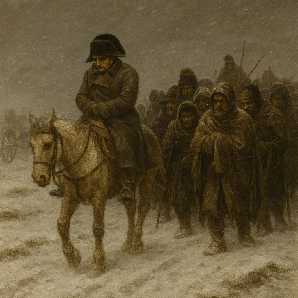 Napoleone ritorna dalla Russia.La sua ritirata iniziò a metà ottobre 1812, dopo la disastrosa permanenza a Mosca, incendiata e ormai priva di rifornimenti. L’armata francese, decimata dal freddo, dalla fame e dagli attacchi dei cosacchi, attraversò la Beresina a fine novembre — un passaggio divenuto simbolo della disfatta — e solo una minima parte dei circa 600.000 uomini che erano partiti tornò in patria.