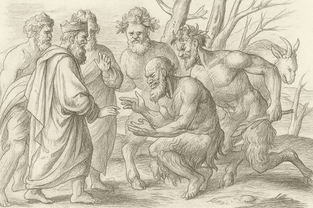 Dietro Sileno, gli altri satiri osservano, come forze della natura che assistono a un incontro tra due ordini diversi: la cultura e l’istinto, l’uomo e il caos primordiale. I loro corpi muscolosi, le corna, i volti caprini richiamano la potenza vitale e amorale di Dioniso.