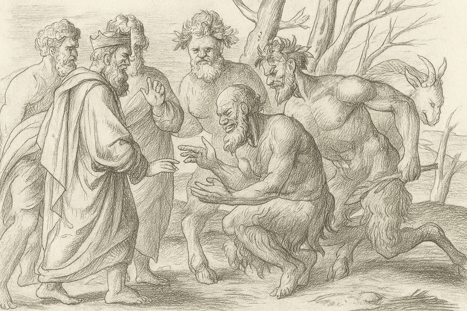 Di fronte a lui, al centro, c’è Sileno, il vecchio satiro — metà uomo e metà bestia — piegato sulle ginocchia, con le mani aperte in un gesto di parola e di derisione. Il suo volto rugoso ride, ma la risata è ambigua: è la risata di chi conosce il dolore del mondo. In lui si concentrano la sapienza tragica e il disincanto, l’intuizione che la vita, vista nella sua interezza, non ha giustificazione, e che la gioia umana è solo un fragile intervallo tra nascita e morte.